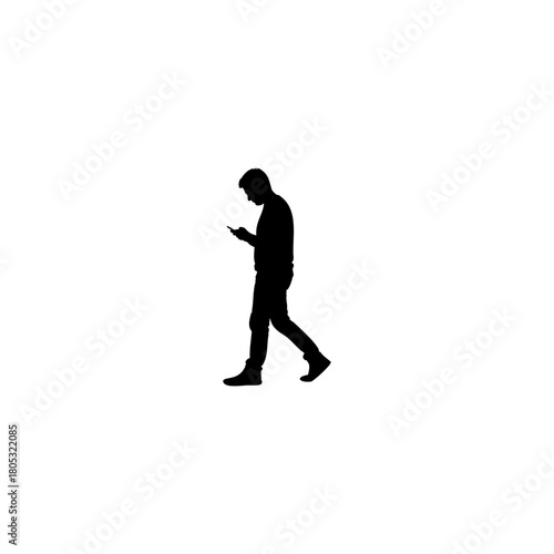 Modern man walking and using his smartphone in silhouette isolated on white background for easy use