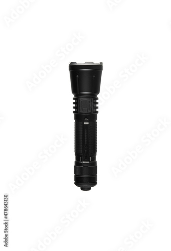 Modern metal LED flashlight. Portable lighting device. Isolate on a white back