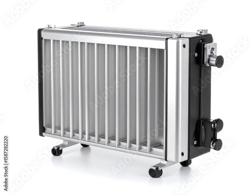 Modern, metallic heater on wheels