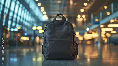 Modern Minimalist Black Backpack Hanging on Metal Hook in Airport Setting