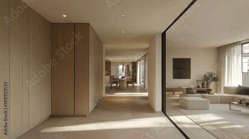 Modern minimalist hallway leading to open-plan living area