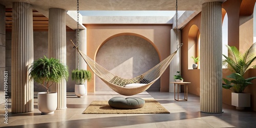 Modern Minimalist Hammock Interior: Concrete Pillars, Geometric Crochet, Scandinavian Design
