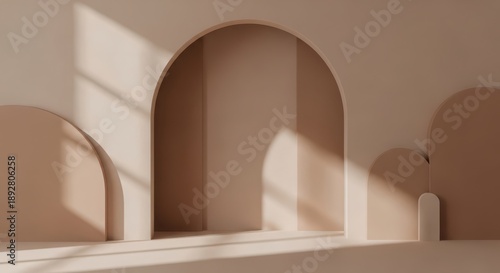 Modern minimalist interior with arched doorway casting soft sunlight shadows on beige wall and floor