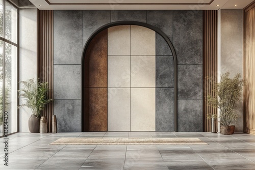 Modern minimalist interior with arched doorway, concrete wall, plants, and rug.