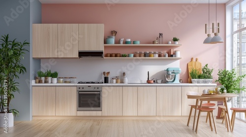 Modern minimalist kitchen design with wood cabinets and plants