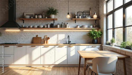 Modern minimalist kitchen interior design. White cabinets, wooden table, brick wall. Scandinavian style home decor, green plants, big window. Bright natural light, cozy home. Interior design concept,