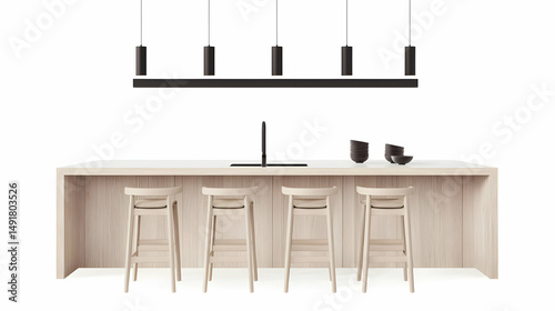 Modern Minimalist Kitchen Interior with Stylish Bar Stools and Lighting
