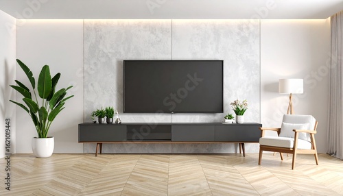 Modern Minimalist Living Room Herringbone Floor Concrete Wall and Sleek TV Console.