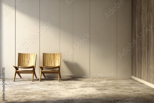 Modern minimalist room with wooden chairs. Sunlight streams in