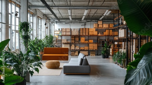 Modern Minimalist Warehouse Interior with Greenery and Furniture