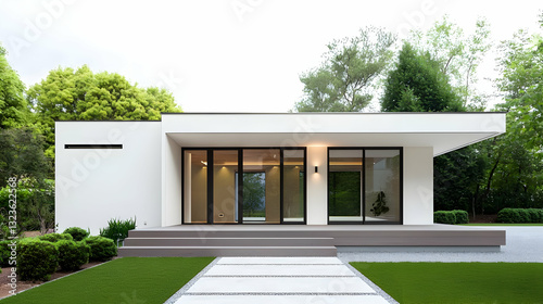 Modern Minimalist White House Exterior With Glass Windows and Lush Green Surroundings Under Bright Daylight
