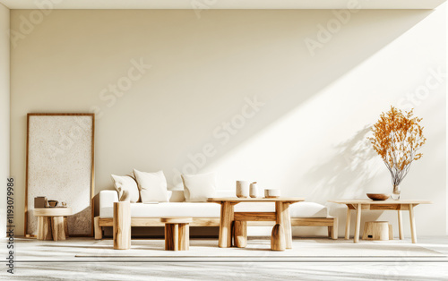 Modern minimalistic living room with natural wood furniture and warm lighting in a bright space