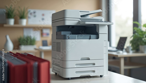 Modern multifunction office copier printer device on desk. White-grey colors. Digital tech for document, paper copy, scan, print, fax, network. Business, pro, workplace interior with room design.