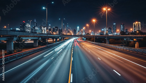 Modern multi-lane highway with dynamic vehicle light streaks and city skyline.