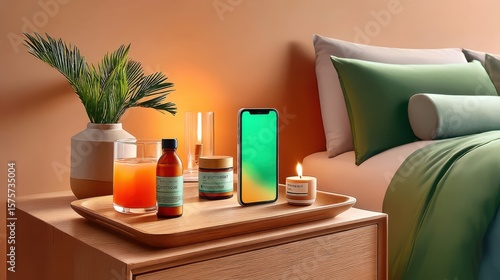 Modern nightstand setup with wellness items and smartphone in serene setting