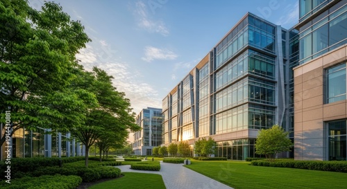 modern office building complex with green courtyard