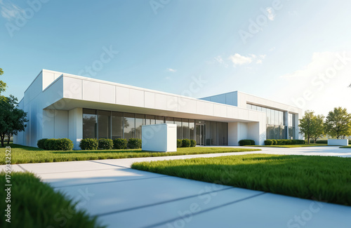 Modern office building exterior with hydrogen fuel cell unit for clean energy. Sustainable architecture of corporate business center with glass facade. Green lawn surrounds industrial research