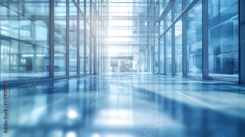 Modern Office Building Interior with Glass Windows & Shiny Floor in Blue Tones