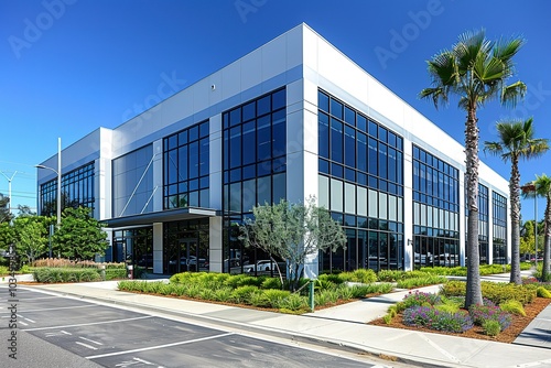 Modern office building with large windows and palm trees.
