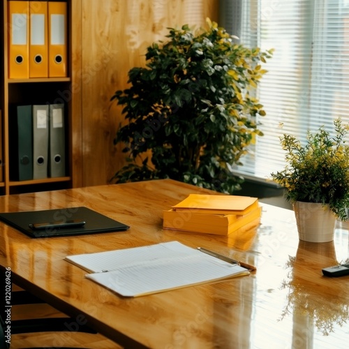 Modern Office Desk Workspace Documents Plants Yellow Folders Notebook Smartphone