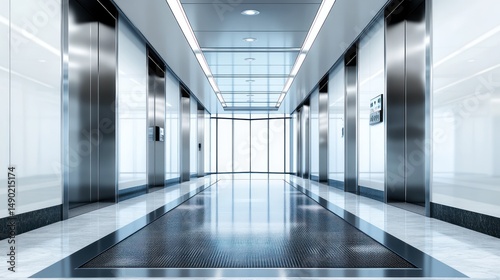 Modern office elevator lobby, city view