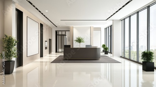 Modern office interior featuring sleek furniture and large windows for natural light.