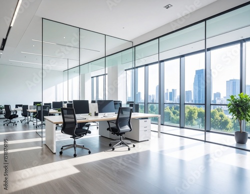 Modern office interior with minimalist design, clean workspace, natural lighting, professional environment, corporate setting