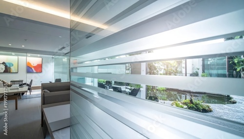Modern Office Interior with Natural Light and Greenery.