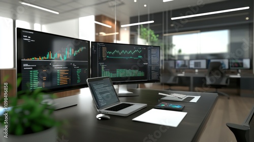 Modern office setup with multiple screens and devices.