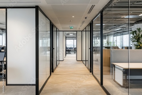 Modern office with white and glass walls, creating a bright, open ambiance. Organized desks and chairs boost productivity and collaboration.