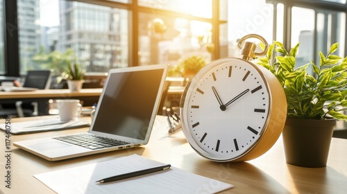 Modern Office Workspace with Laptop, Clock, and Plant.