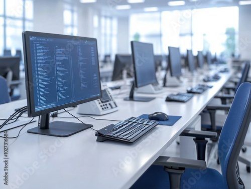 Modern Open Office With Computers And Blue Chairs Professional Workspace