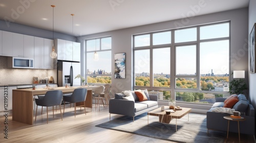 Modern Open-Concept Living: A spacious and modern open-plan living space featuring a sleek kitchen with island seating seamlessly flowing into a comfortable living room.