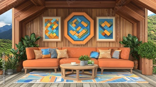 Modern orange couch in a wooden cabin with abstract art and mountain view. Cozy living room with plants and rug.