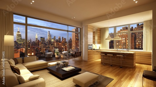 Modern penthouse apartment with city views. Open-plan living area with spacious windows showcasing a stunning Manhattan skyline at dusk.