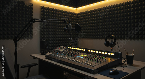 Modern podcast studio interior with professional audio gear and warm, minimalist lighting.