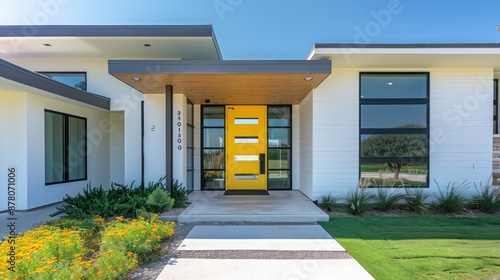 Modern ranch with a simplistic, clean design that features a bright, inviting yellow front door