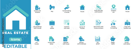Modern real estate vector icons for property, architecture and urban design. Clean scalable illustrations for apps, presentations and marketing