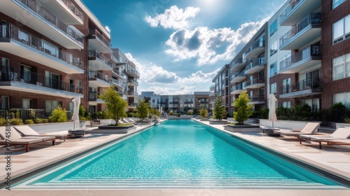 Modern residential apartment building complex with outdoor swimming pool. Luxury condominium terrace area for leisure and relaxation. Urban housing architecture with sun lounger and tree.