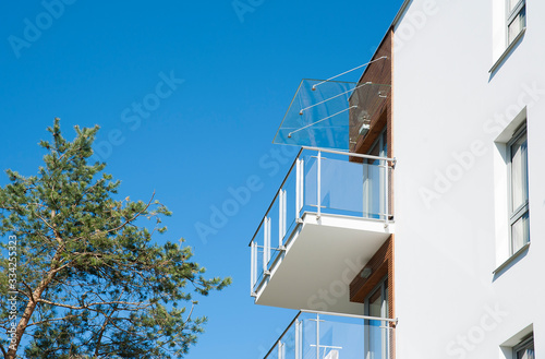 Modern residential building with huge terrace and wooden facade elements