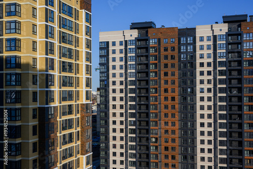 Modern residential buildings with varied facades against clear blue sky