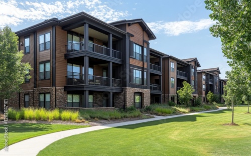 Modern Residential Complex Surrounded by Lush Greenery on a Sunny Day Featuring Balconies and Well-Maintained Landscaping for Urban Living