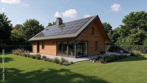 Modern residential house with a solar panel on top