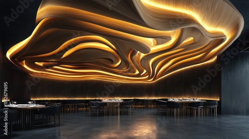 Modern restaurant interior with abstract wooden ceiling.