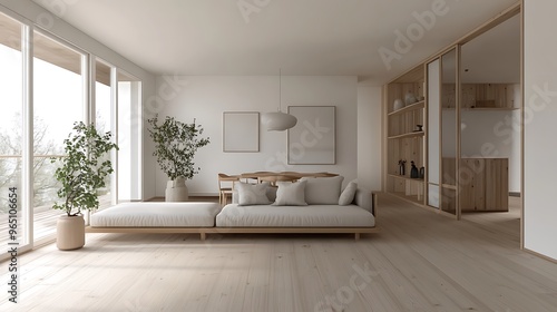 Modern Scandinavian Living Room with Light Wood Floors, Sleek Sofa, and Minimalistic Decor for a Warm and Inviting Space