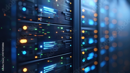 Modern server room with bright blue and orange lights on digital equipment racks, symbolizing data storage, cloud computing, and secure infrastructure systems