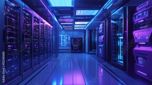 Modern server room with numerous multi-faceted cabinets, blue and purple lighting