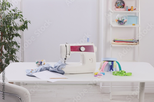 Modern sewing machine, fabric and accessories on table indoors