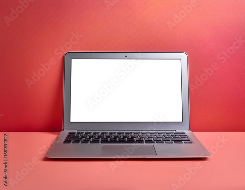 modern silver laptop with blank screen on a coral pink background computer technology