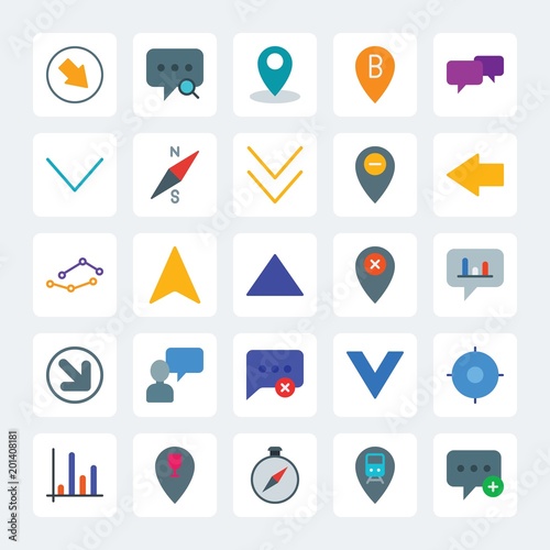 Modern Simple Set of location, arrows, charts, chat and messenger Vector flat Icons. .Contains such Icons as travel, pin, chat, restaurant and more on gray background. Fully Editable. Pixel Perfect